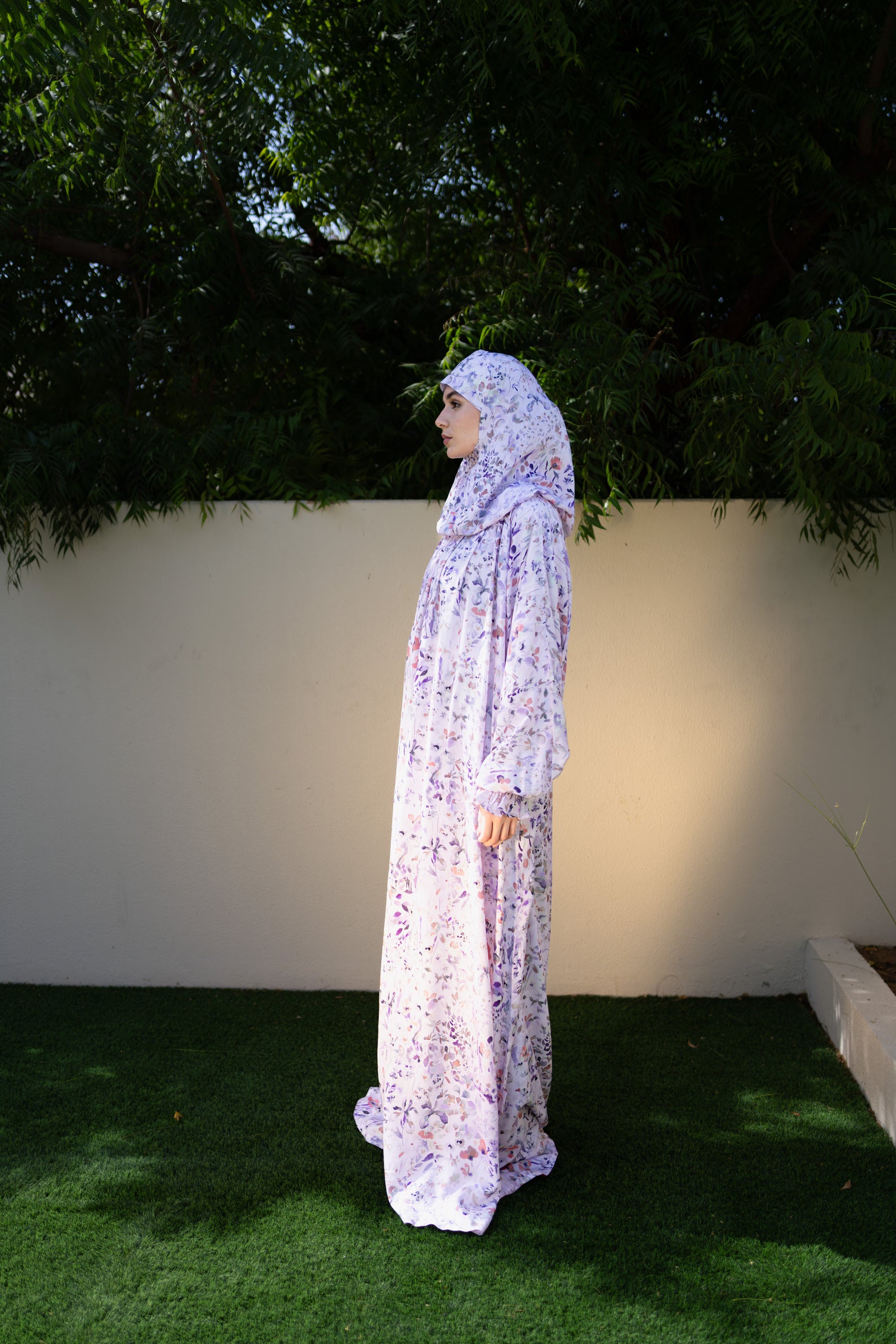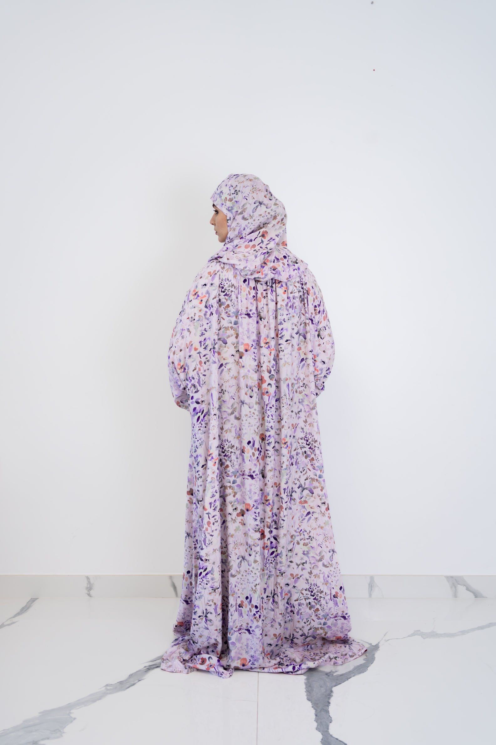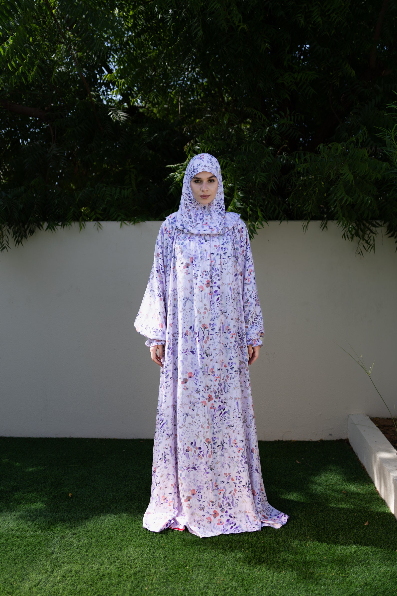 Elegant A-line design offers full, modest coverage with natural, graceful movement, featuring an integrated khimar with soft elastic for a secure, lightweight, and easy fit. The built-in velvet guide ribbon ensures effortless dressing, while wide sleeves with soft elastic cuffs stay comfortably in place during all prayer positions. Crafted from breathable, soft, high-quality fabric, it provides maximum comfort and airflow, with a stable and comfortable fit that allows smooth movements, including Tasleem—designed to enhance focus, serenity, and ease throughout your prayer.