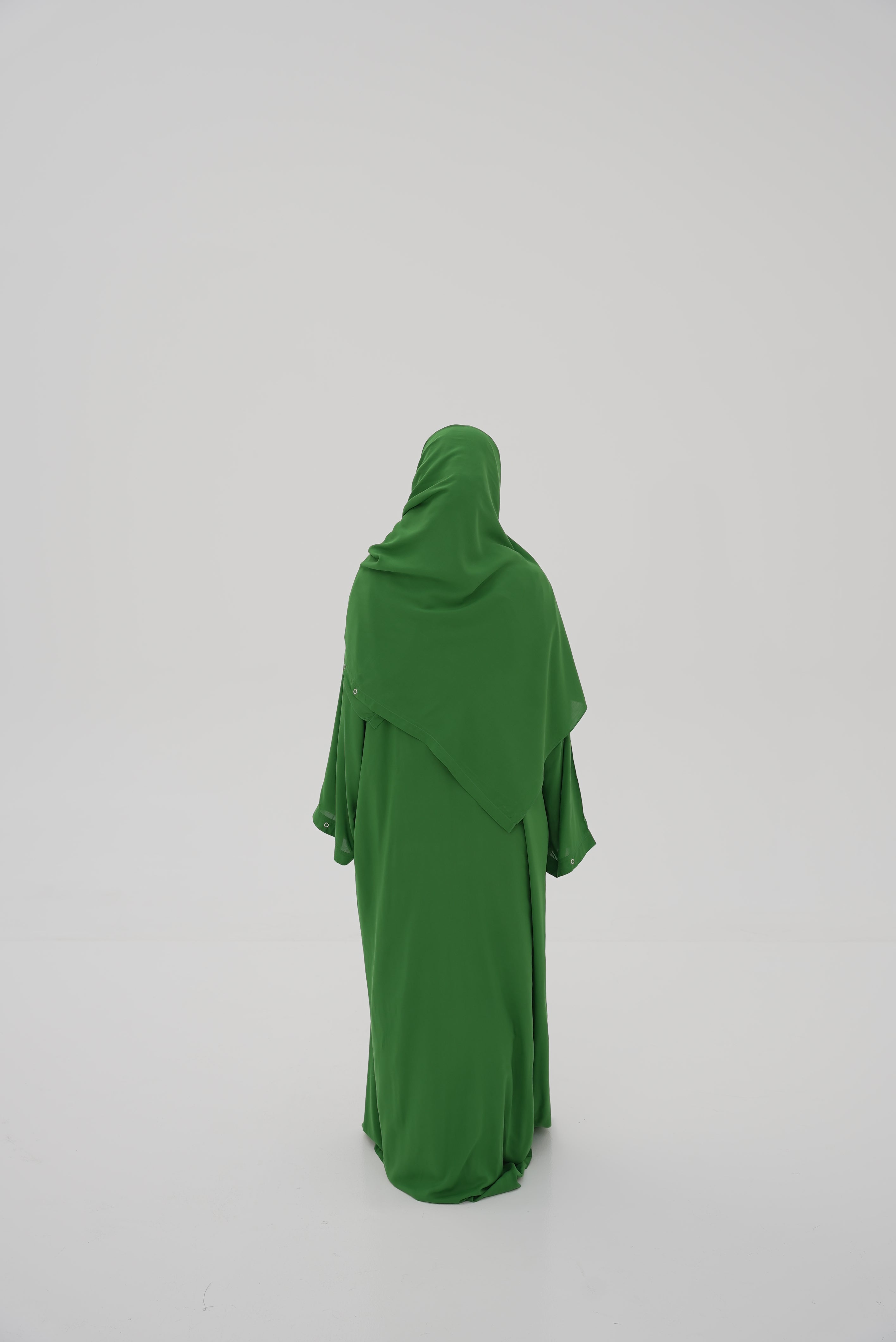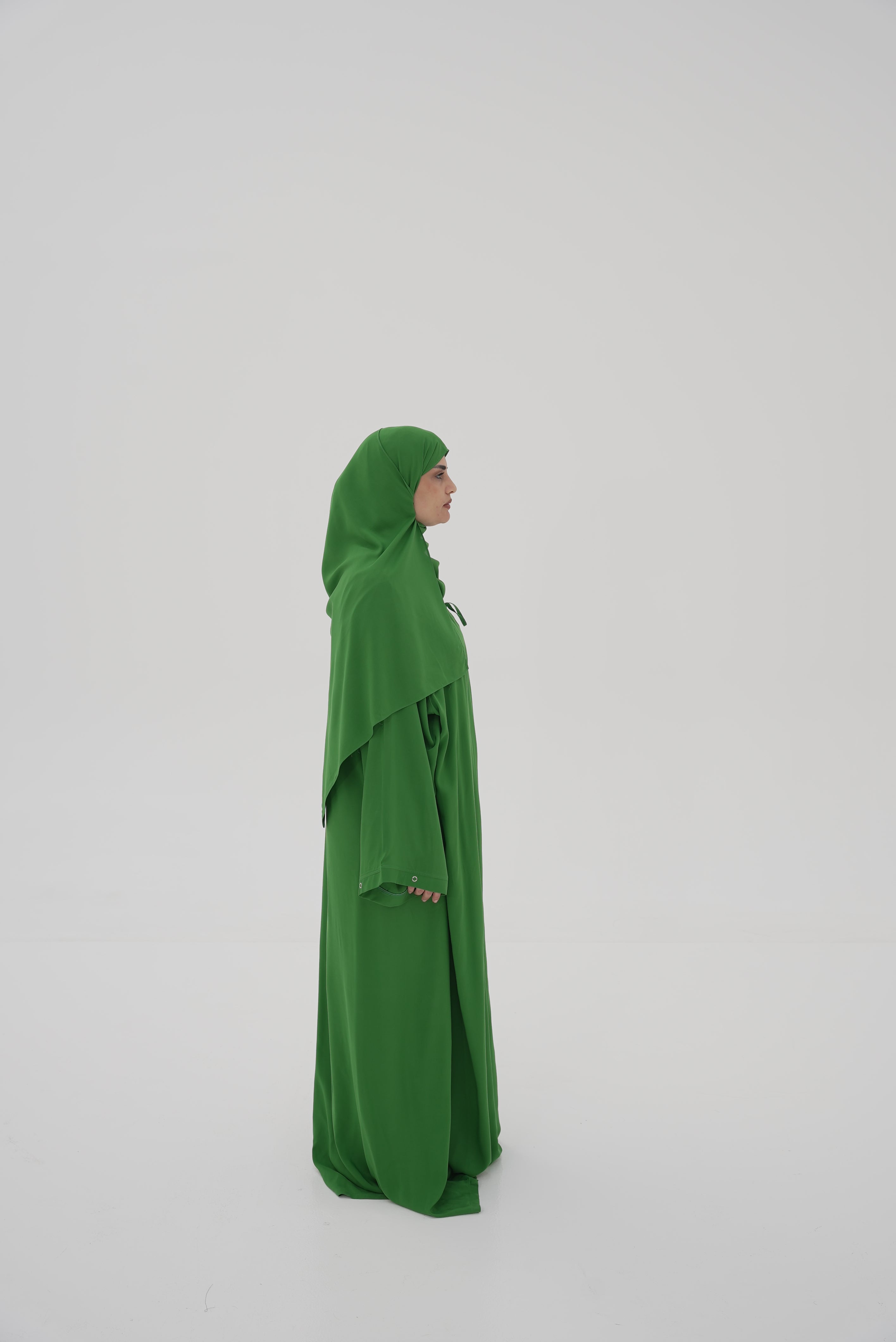 Lifaa is a contemporary prayer garment combining practical elegance with smooth flowing comfort. It features an open-front design with an A-line silhouette that gradually widens from top to bottom, offering full coverage and unrestricted movement in all prayer positions. The garment incorporates a crossover-style wrap with a side tie that allows for easy adjustment and adds a refined, aesthetic touch.