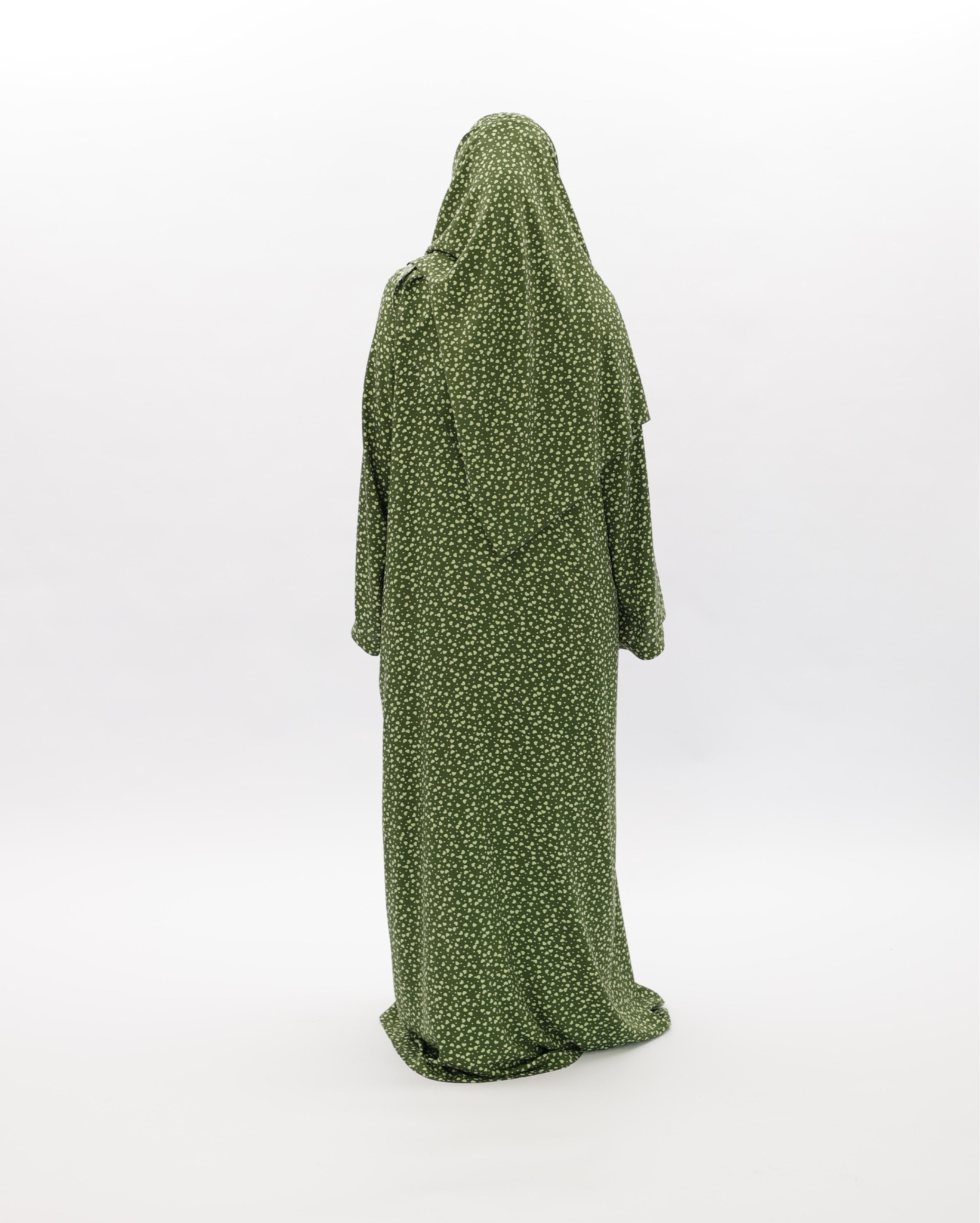 Lifaa is a contemporary prayer garment combining practical elegance with smooth flowing comfort. It features an open-front design with an A-line silhouette that gradually widens from top to bottom, offering full coverage and unrestricted movement in all prayer positions. The garment incorporates a crossover-style wrap with a side tie that allows for easy adjustment and adds a refined, aesthetic touch.