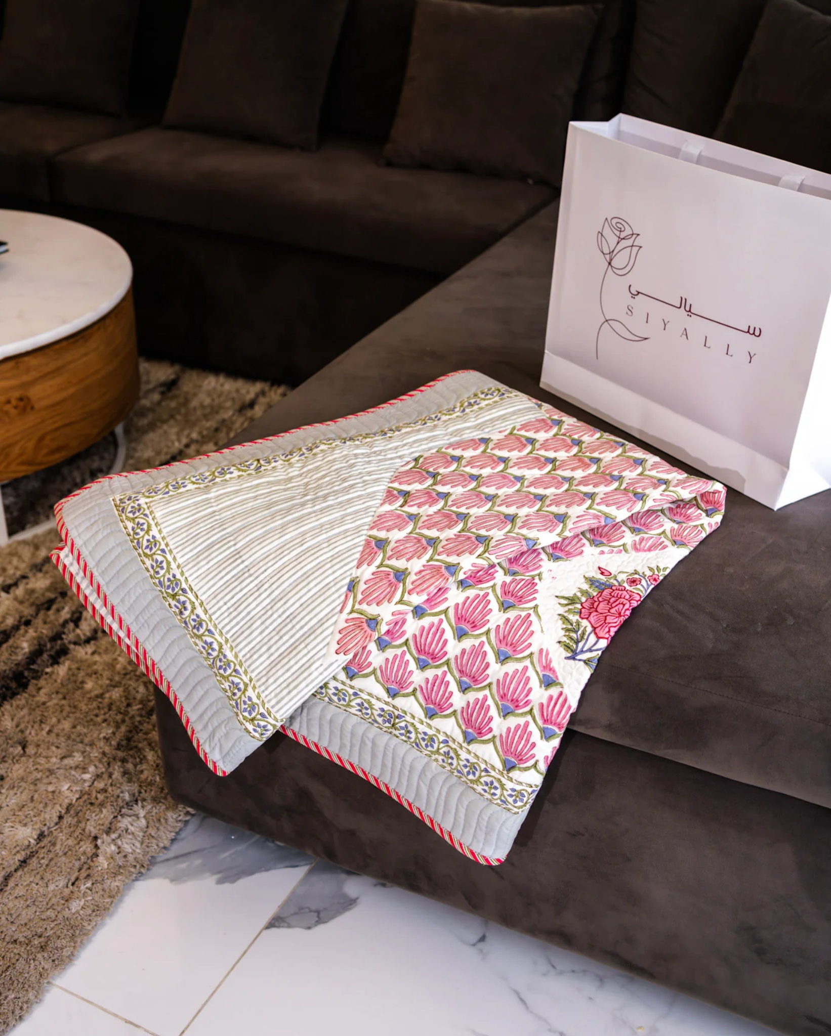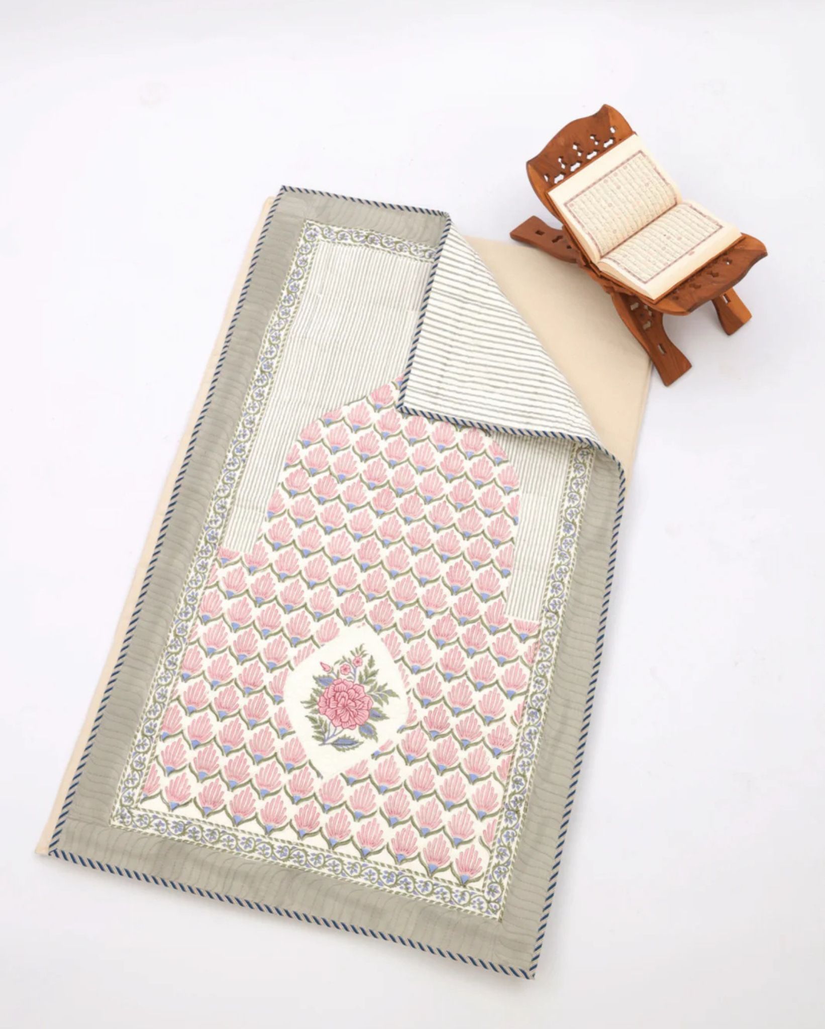 The Noor prayer mat introduces an innovative concept that redefines the prayer experience through comfort and refined design. Unlike traditional one-piece prayer mats, Noor features a thoughtfully designed two-layer system. The top layer is a quilted cotton prayer mat with a thin cotton filling, entirely handmade, measuring approximately 50 inches in length and 30 inches in width (minor variations may occur due to its handcrafted nature). This layer is placed over a comfortable sponge cushioning layer of the same size, with a thickness of approximately 2 cm, enclosed in a durable cover made from natural canvas fabric. The detachable cotton top layer allows for easy washing and maintenance, ensuring better hygiene and ventilation with regular use. It is hand-printed using the traditional block print technique, reflecting authentic craftsmanship and artisanal detail.